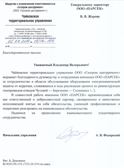 05.04.2018 Благодарность ООО «Газпром центрремонт» (ЧБС)