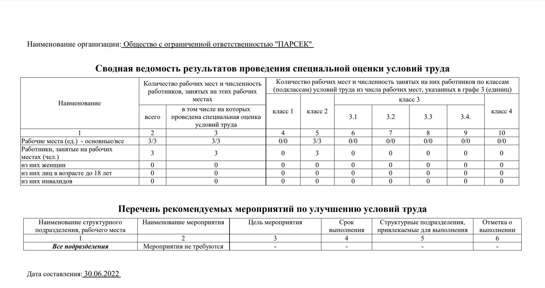 В соответствии с требованиями нормативных документов в области охраны труда в ООО "ПАРСЕК" проведена специальная оценка условий труда вновь организованных рабочих местах.