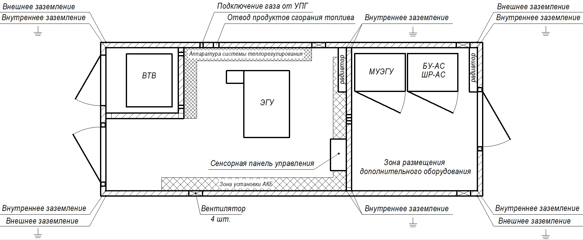 Все оборудование размещено в утепленном модульном каркасном контейнере полной заводской готовности.